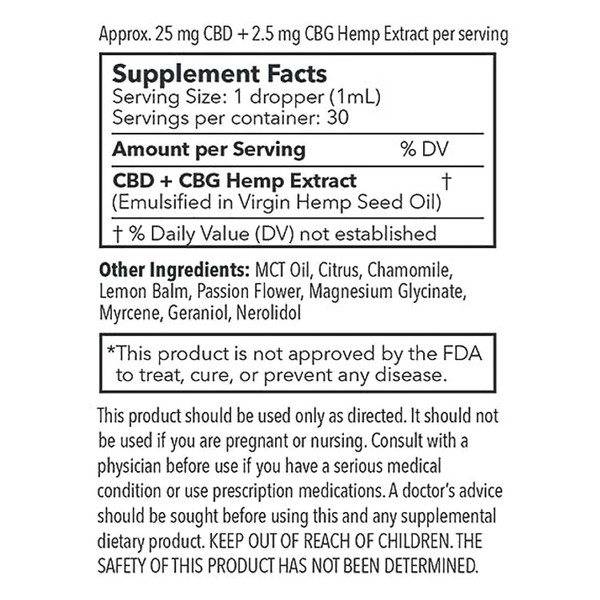 - CBD + CBG from broad spectrum hemp extract, mct oil, citrus, chamomile, lemon balm, passion flower, magnesium glycinate, myrcene, geraniol, nerolidol.